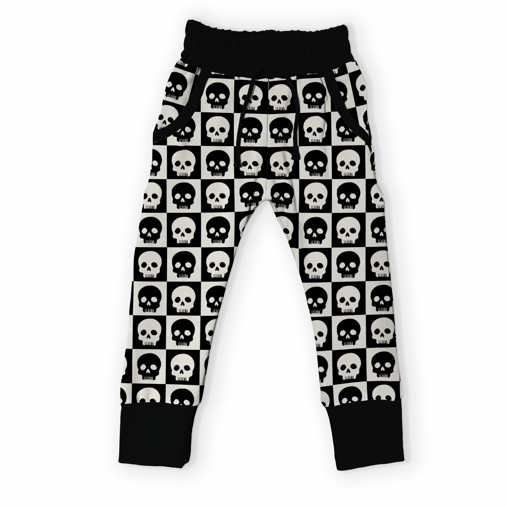 Our Skull Check joggers mix underground attitude with all-day comfort. Featuring functional pockets, decorative drawstrings, and a black elasticated waistband sewn in place so it won’t twist, these joggers are made to survive playtime, mosh pits (aka playgrounds), and lazy days alike.