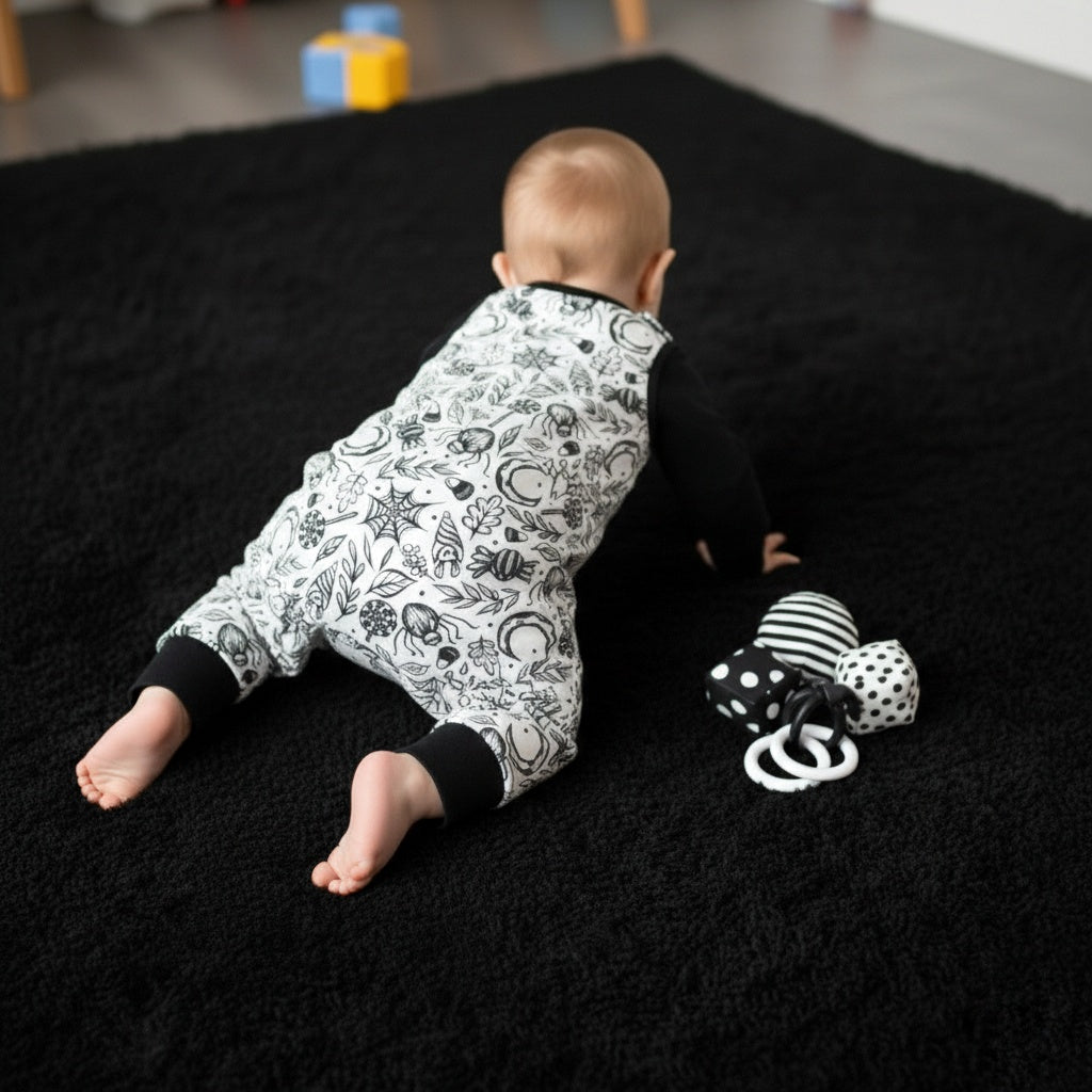 Built for tiny rebels, midnight crawlers, and future headliners. Our Garden of Webs harem romper is designed for comfort, movement, and unmistakable alternative style. Featuring a relaxed fit through the legs and a dropped crotch, this piece allows full freedom for crawling, climbing, and chaos.