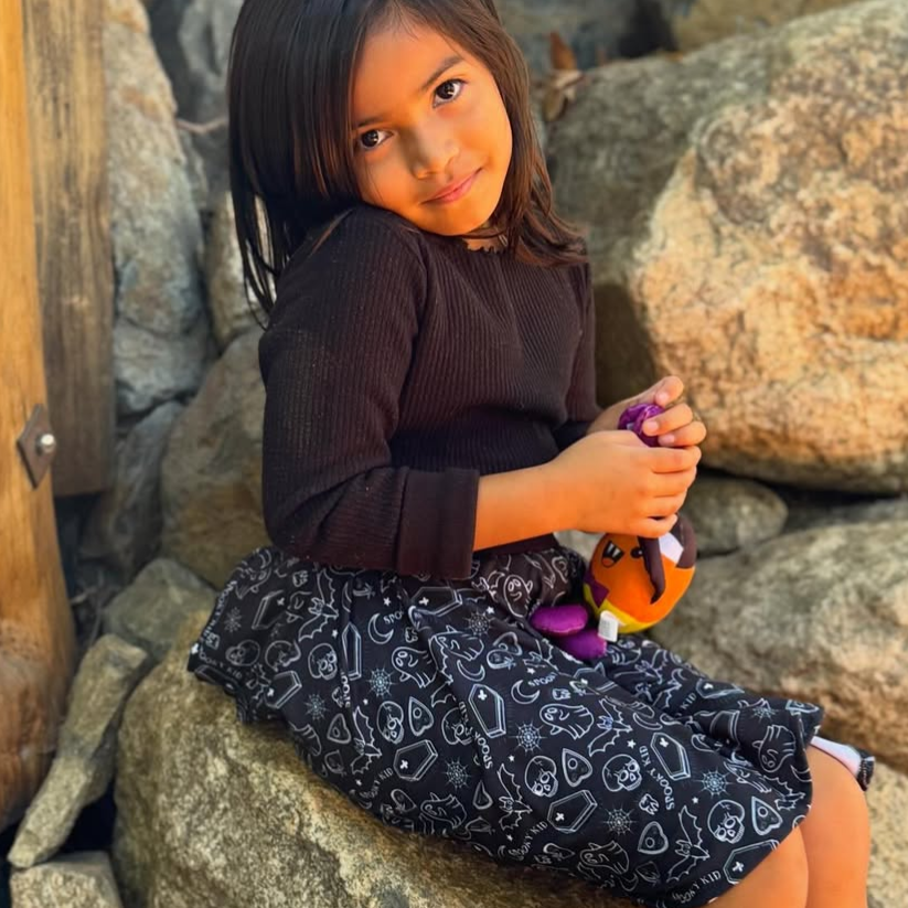 Our Garden of Webs twirly skirt is made for magical spins and spooky fun. Featuring a soft black waistband and an extra twirly silhouette, this skirt is a favorite for kids who love to move.